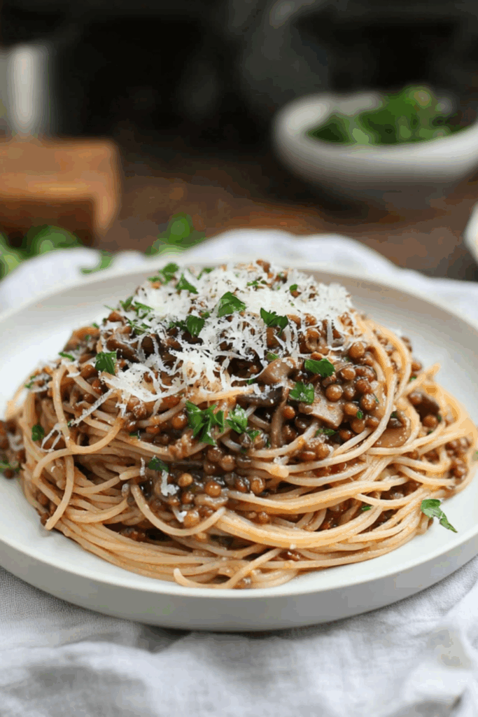 A rich, rustic vegetarian Bolognese with lentils, porcini mushrooms, and a splash of red wine — comfort food without compromise.