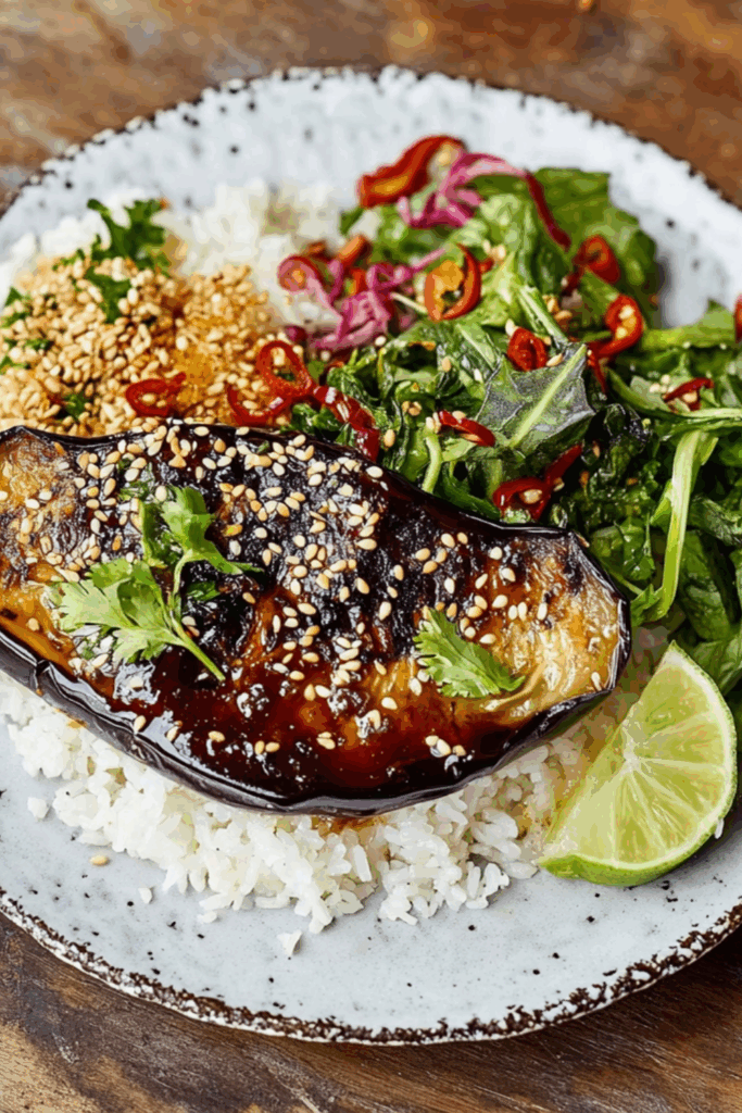Tender steamed aubergine pan-fried in a glossy miso-honey-chilli glaze, served with fragrant coconut rice and toasted sesame seeds.