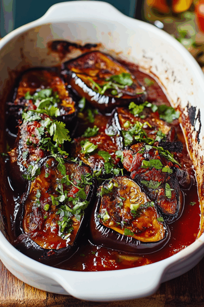 - Turn oven to 200°C, pour glaze over aubergines, roast 15 mins more.