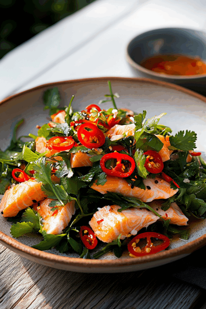 A bright, herby Vietnamese-style salad with flaky seared salmon, crunchy veg, and a bold, salty-sweet dressing.