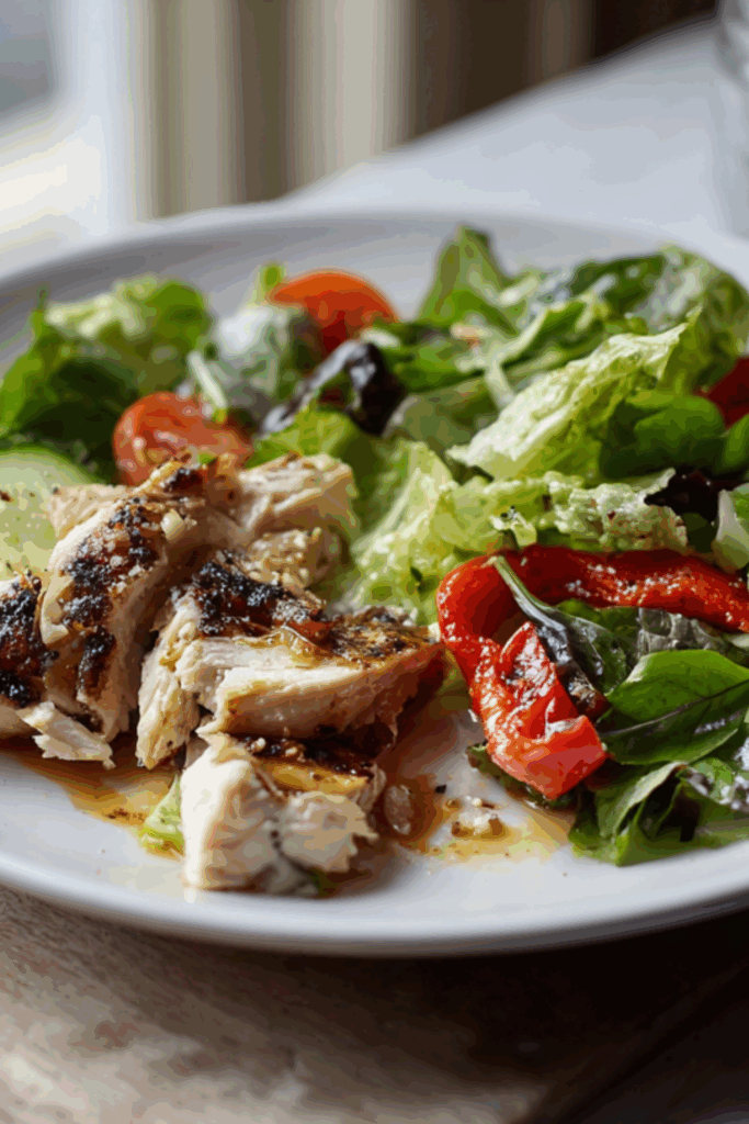 This warm chicken salad saved the day. Inspired by Jamie Oliver but twisted with my own habits (read: shortcuts), it’s one of those meals that looks fancier than it feels. Juicy, golden chicken laid over crunchy greens, with warm, sweet peppers and a sharp zing of lemon and balsamic… it somehow tastes like you planned dinner even if you totally didn’t. It’s what I make when I need food fast but still want to feel like I made a proper meal — not just toast again.
