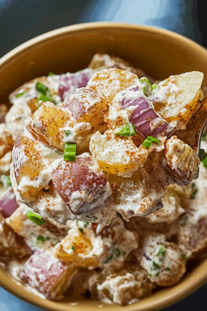 This isn’t your average picnic potato salad. It’s got creamy mayo (yes, real mayo), a bit of bite from Dijon, and a little heat from cayenne that sneaks up on you — in a good way. There’s Parmesan for that salty-savoury edge, and the green onions bring in a nice crunch without being loud about it. I’ve made this on lazy weekends, brought it to casual dinners, and even eaten it straight out of the mixing bowl on the kitchen counter. No regrets.