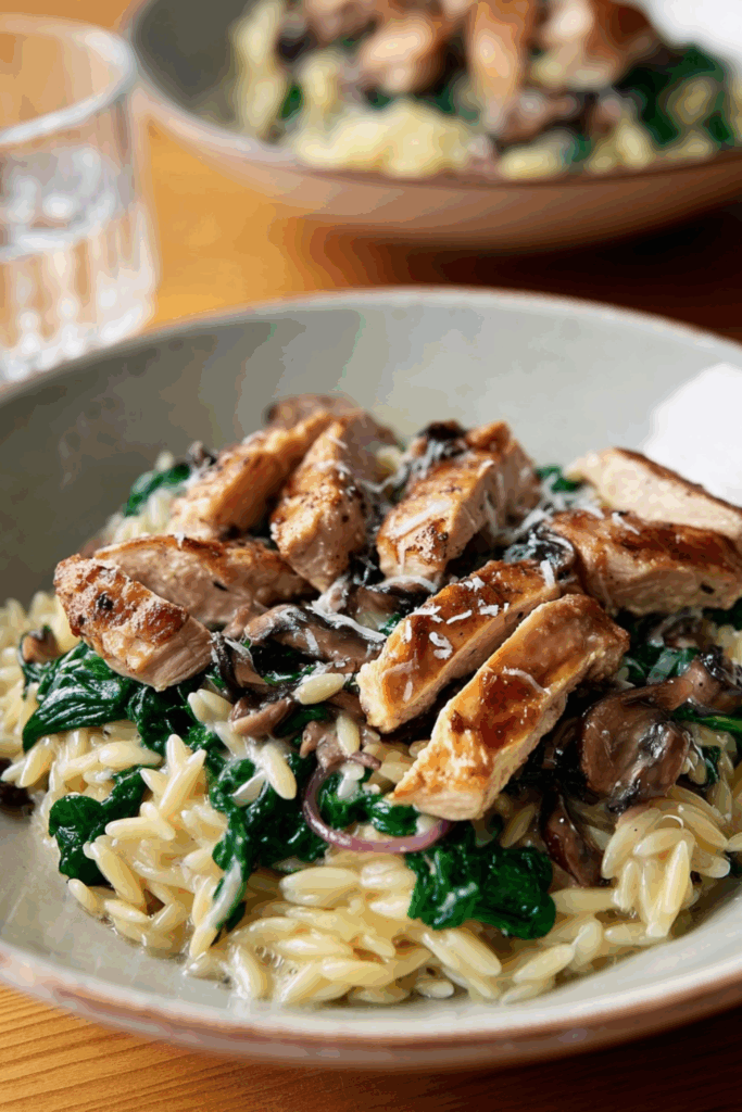 A creamy, risotto-style orzo dish with golden chicken, sautéed mushrooms, and lemony freshness—comforting and elegant.