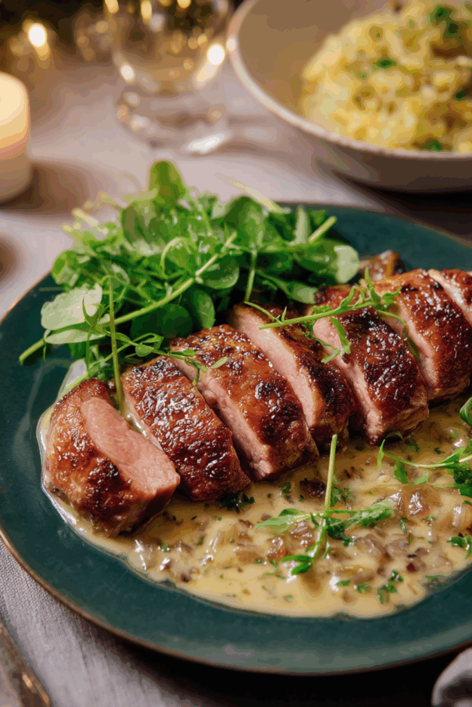 Tender duck breasts paired with a creamy, brandy-infused watercress sauce—perfect for elegant dinners.
