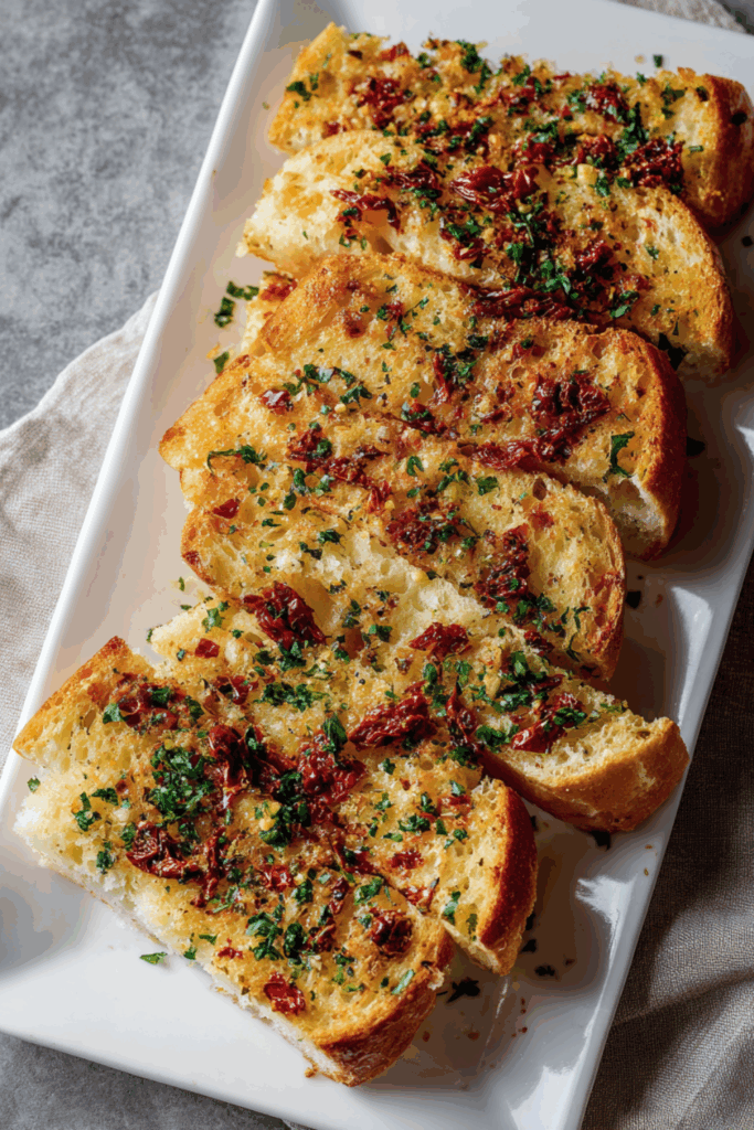 A crispy ciabatta loaf slathered with garlicky, herbed butter and sun-dried tomatoes—golden and irresistible from the grill.