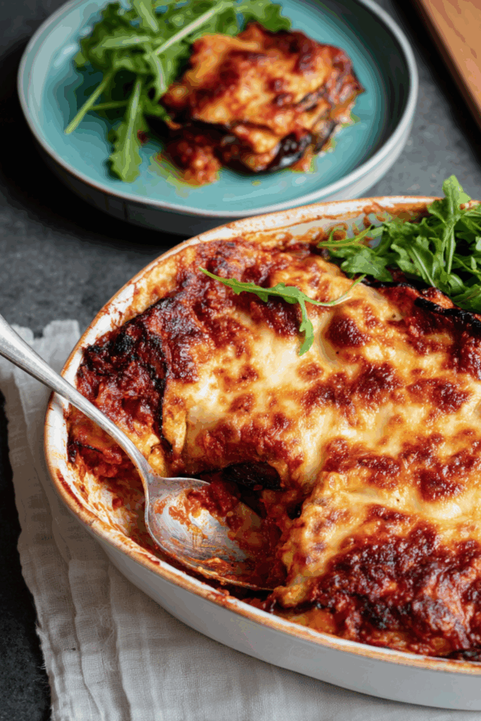 A baked vegetarian lasagne layered with roasted aubergines, rich tomato sauce, and bubbling cheese—simple, satisfying, and full of classic Italian flavor.