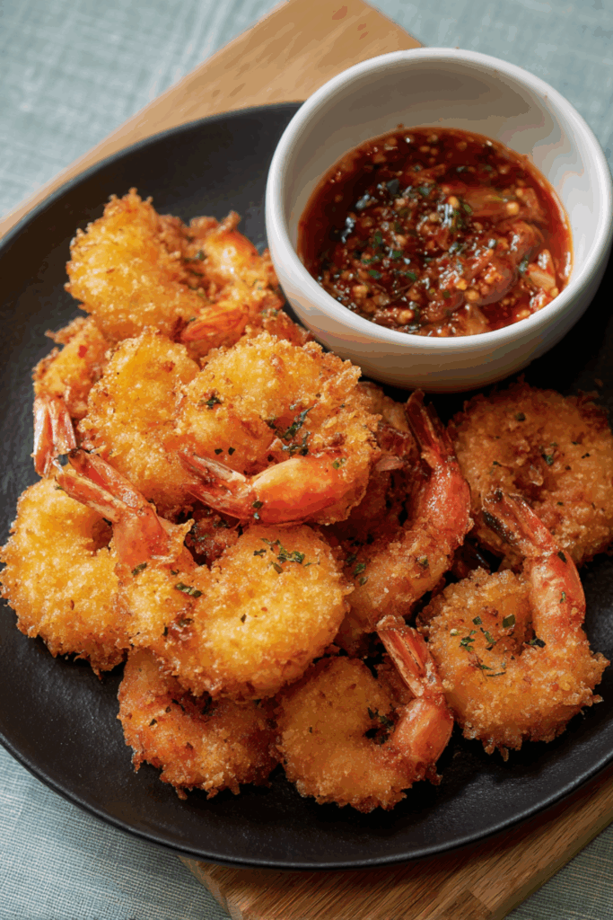 Crispy panko-coated prawns served with a zesty mango chilli dipping sauce—sweet, spicy, and totally addictive.
