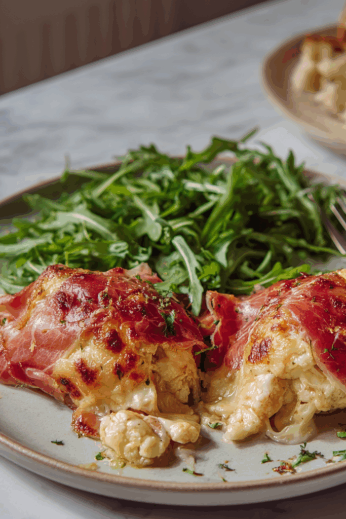 Creamy, cheesy cauliflower filling wrapped in crisp Parma ham — a rich, savory parcel perfect as a side or light main.