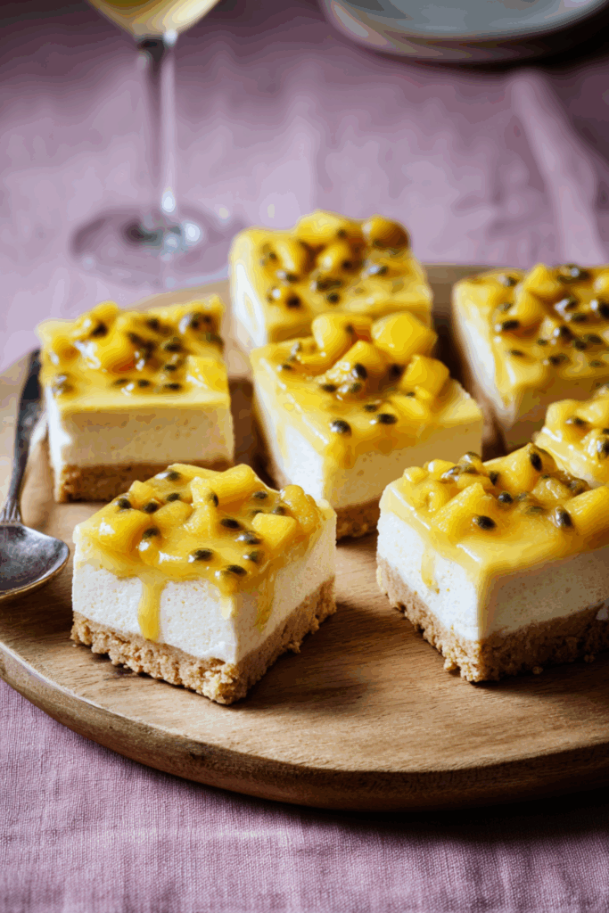 This helps the cheesecake set gently and prevents cracking. - Can I use lemon curd instead of passionfruit?