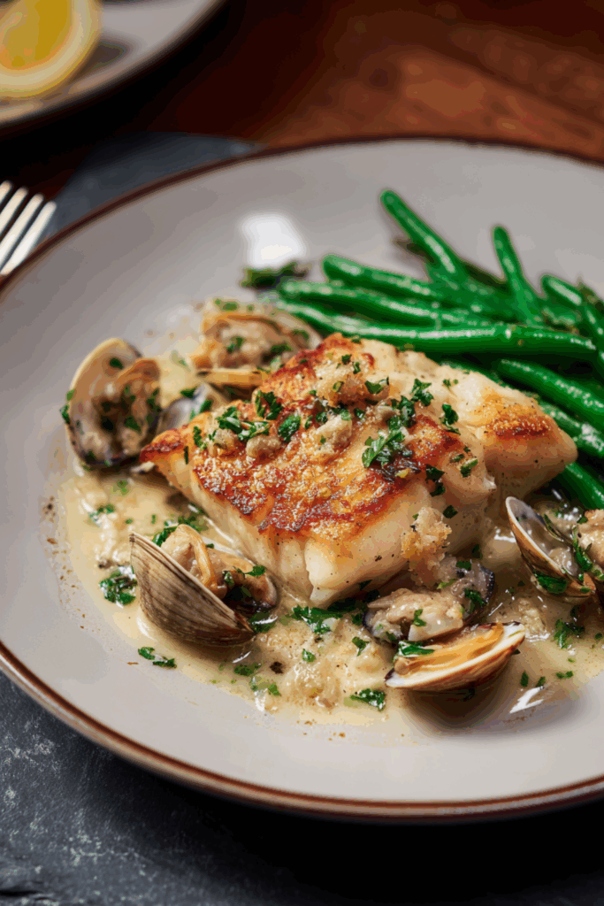 A luxurious seafood main of poached halibut with a creamy clam sauce and vibrant green beans.