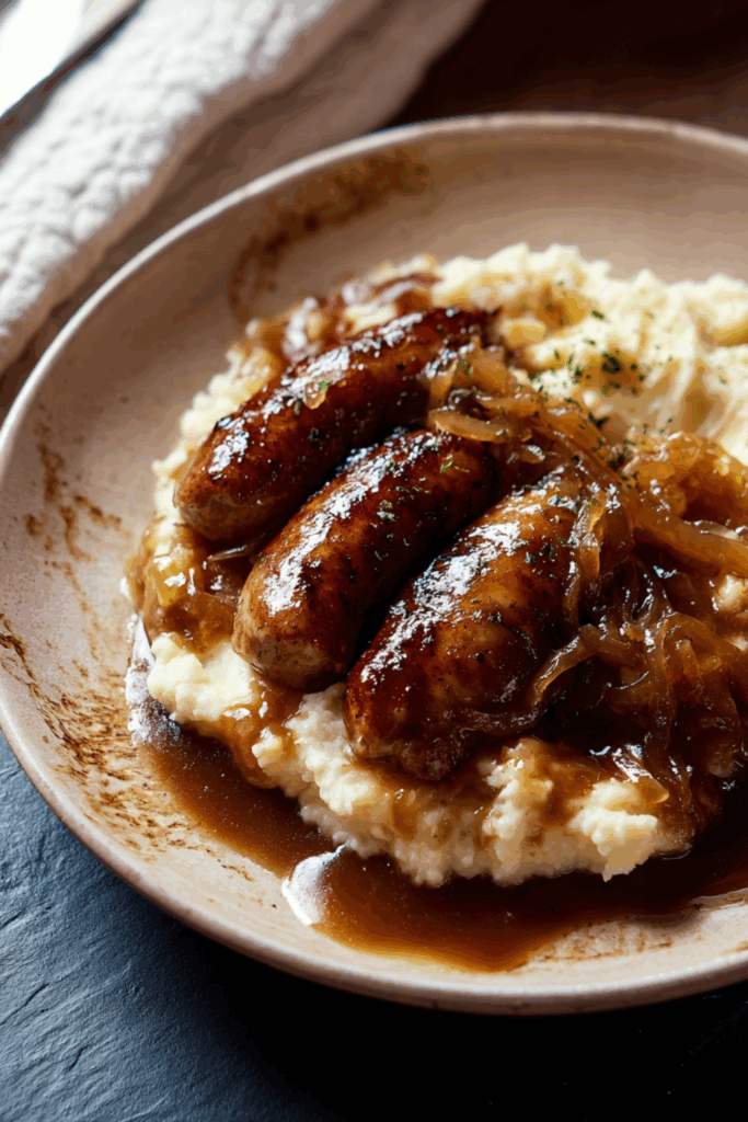 Juicy roasted sausages paired with buttery mustard mash and a rich, savory onion gravy — a comforting British classic perfect for cooler nights.