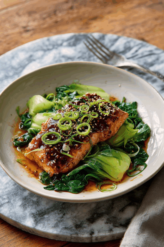 Crisp-skinned trout fillets glazed with a sweet-savoury miso sauce, served over wilted pak choi and spring onions for a fast, flavorful dinner.