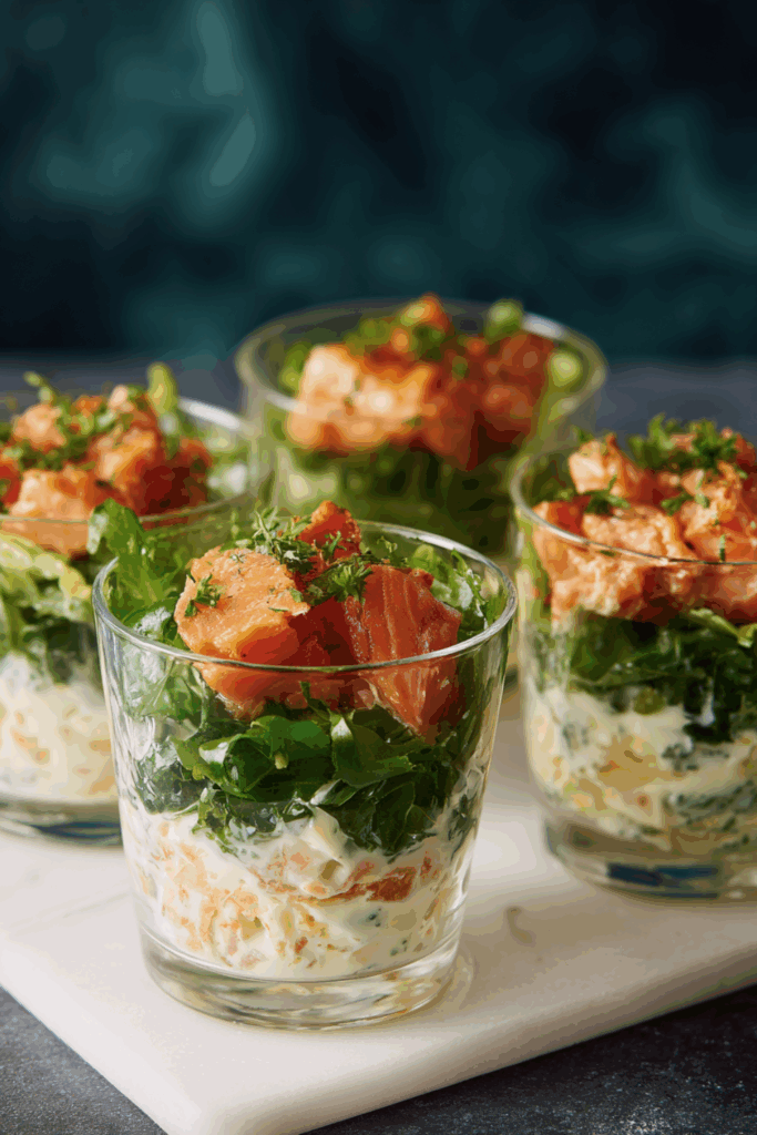 A light, creamy mix of smoked trout, eggs, and crisp veggies, elegantly layered in a tumbler for a refreshing starter or lunch.