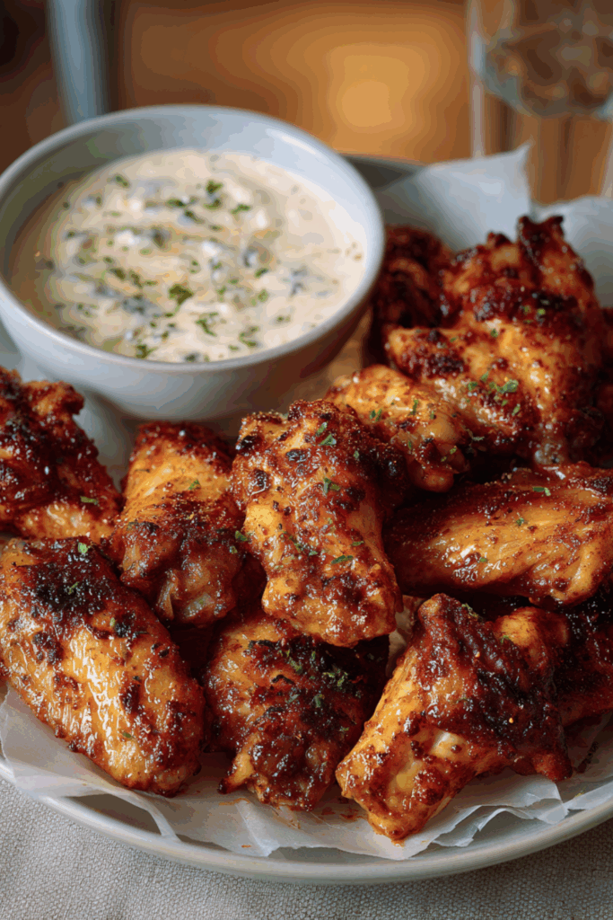 Crispy, spicy roasted chicken wings paired with a cool and tangy sriracha sour cream dip—perfect for parties or family nights.