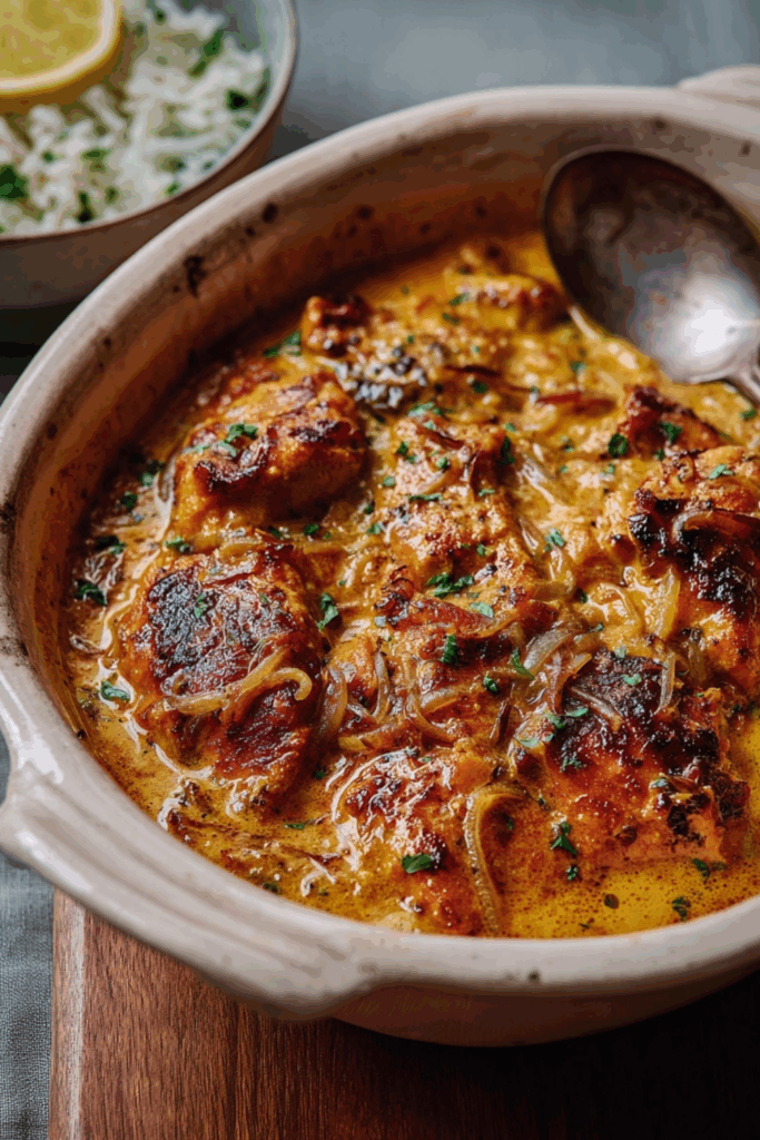 - Bake the Dish: Pour sauce over the chicken and onions, cover with foil or a lid, and bake for 25–30 minutes until fully cooked.