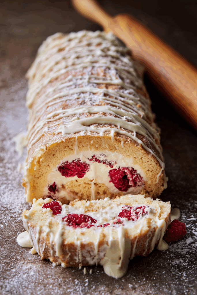 A light, elegant roulade filled with whipped cream and raspberries, wrapped in a soft white chocolate sponge.