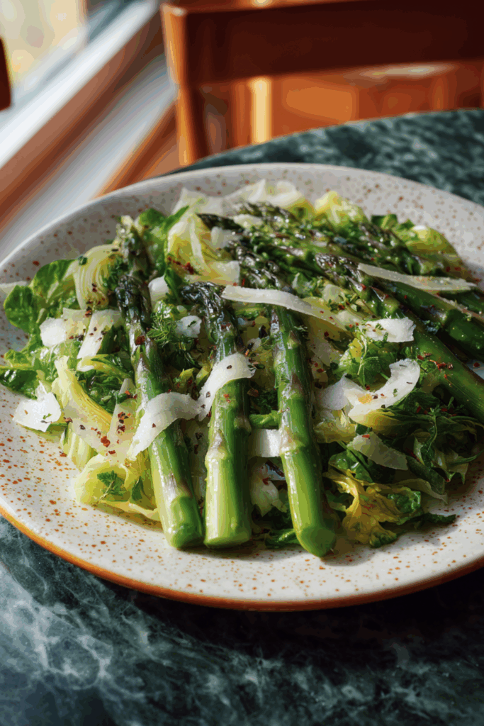 A crisp and elegant salad of blanched asparagus and fennel with Little Gem lettuce, Parmesan shavings, and a zesty tarragon mustard dressing—perfect for warm days.