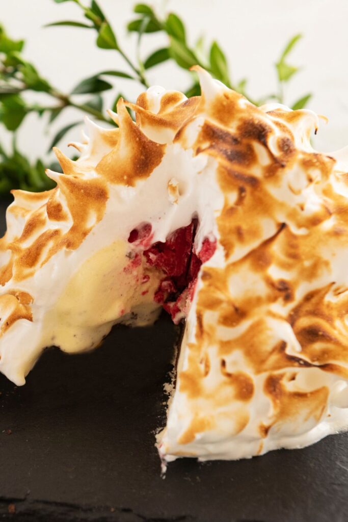 A show-stopping dessert of sponge cake, cherry jam, vanilla ice cream, and golden meringue — crisp outside, cool and creamy within, and perfect for impressing guests.