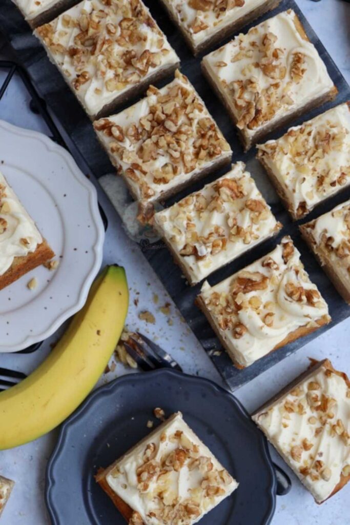 Moist banana tray bake with creamy frosting and walnuts — a simple, comforting classic inspired by Mary Berry.