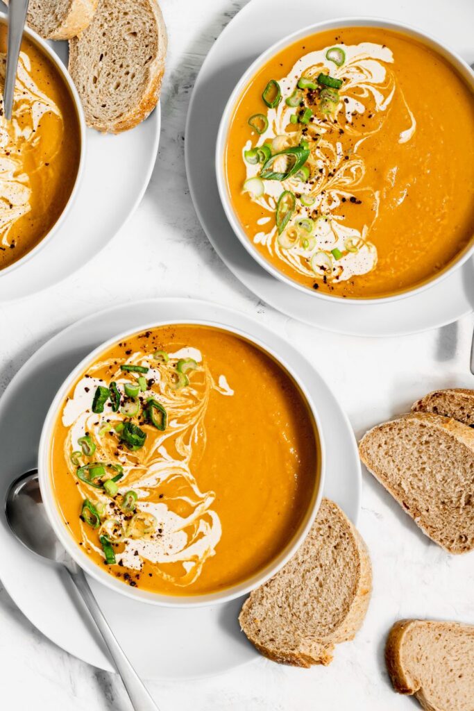 A comforting, colourful soup made from roasted squash and peppers, blended until silky-smooth with miso and plant milk — perfect for chilly days and light suppers.