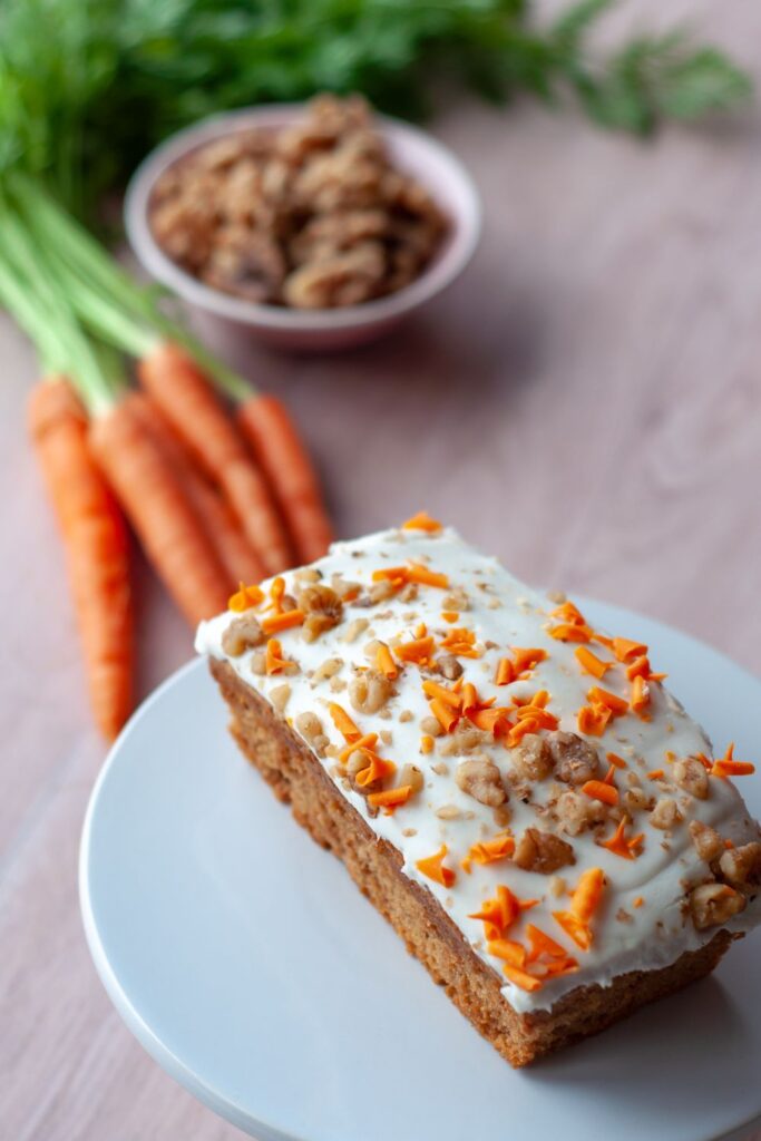 A moist and warmly spiced carrot cake loaf topped with tangy cream cheese frosting — simple to make, perfect for tea time or an anytime sweet treat.