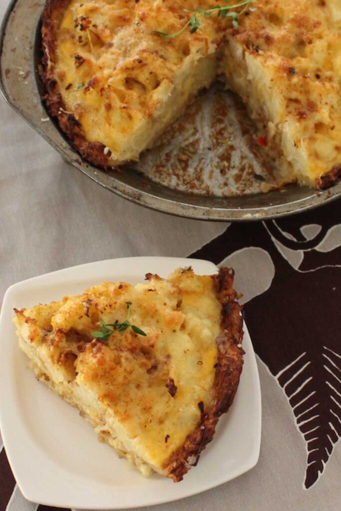 A warm, creamy cauliflower and cheese pie nestled in a crispy potato crust — rustic comfort with a bit of flair.