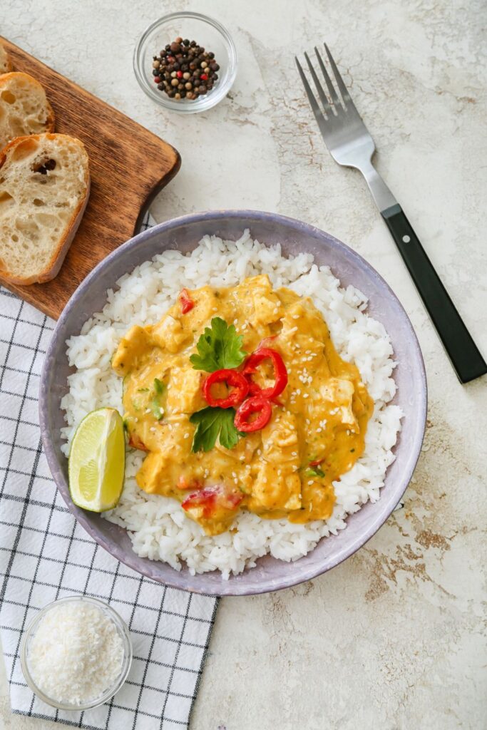 A quick, creamy chicken curry simmered in coconut milk with bold spices and sweet peppers — rich, warming, and ready in just 25 minutes.