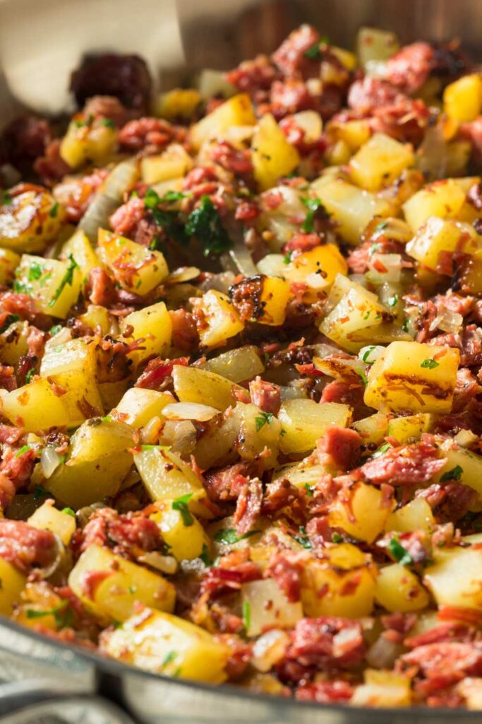 - Return corned beef to the pan, stir gently, and cook for another 5–8 minutes until everything is hot and slightly crispy.