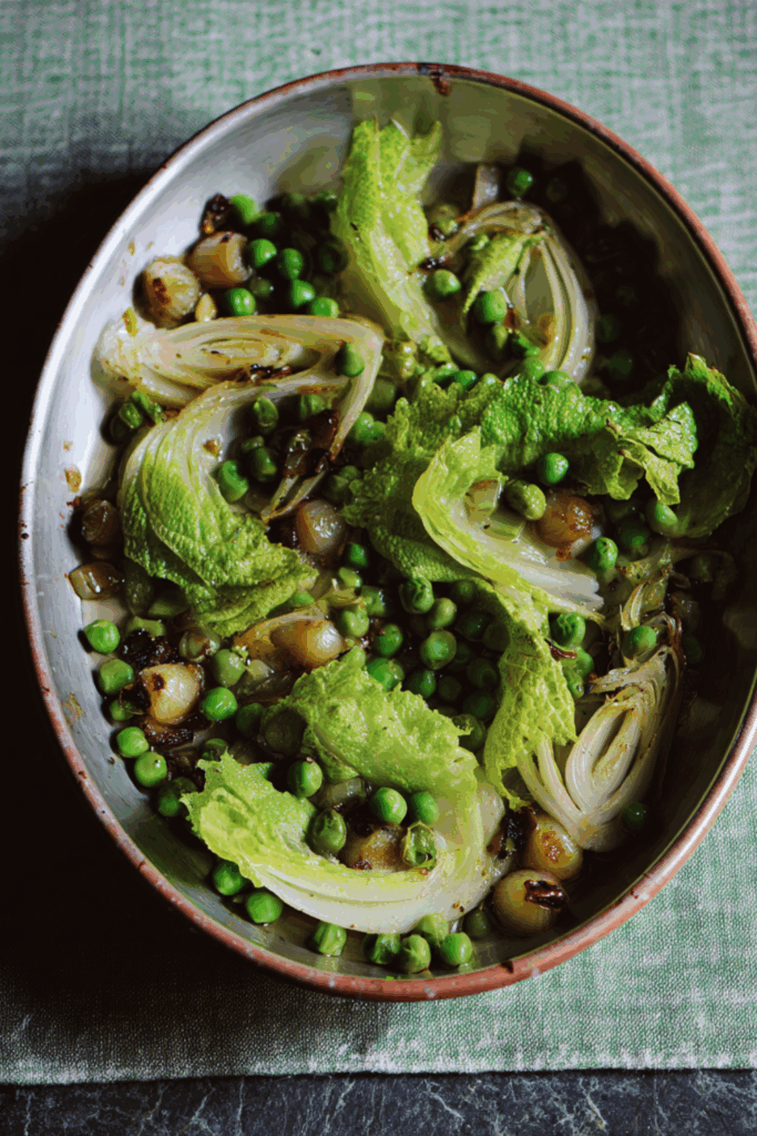 A tender and buttery dish of peas simmered with shallots, lettuce, mint, and white wine—fresh, fragrant, and easy to make.