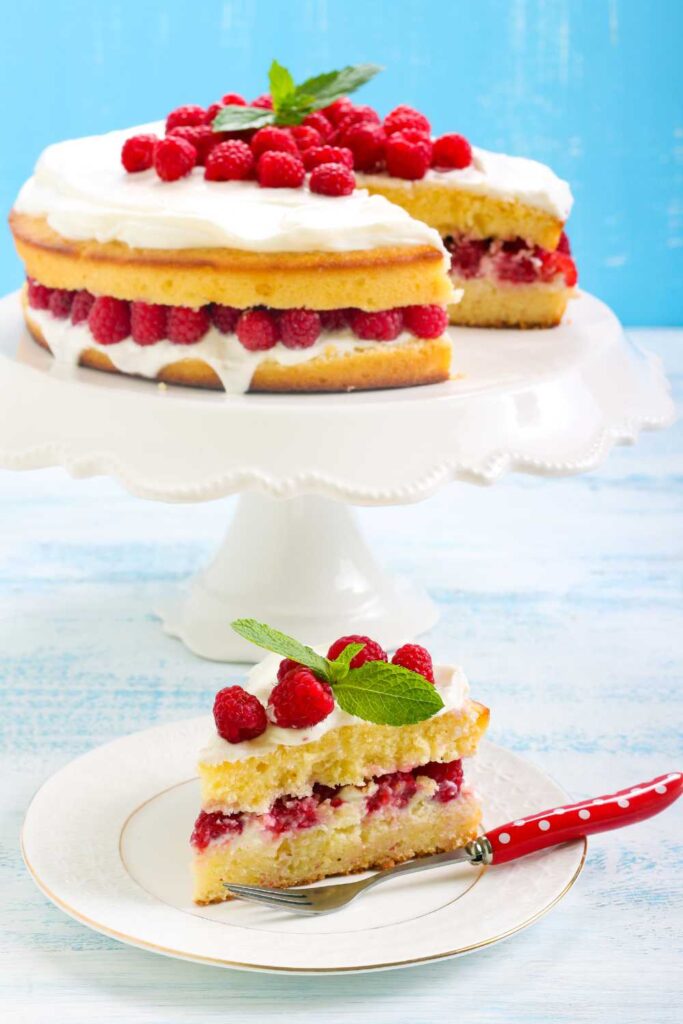Frost the bottom layer, spread on a bit of raspberry jam if you fancy, then stack the second layer. Frost the whole thing however you like — rustic swirls or smooth and neat. Chill for 20 minutes to set, then garnish with raspberries and lemon slices if you’re showing off.