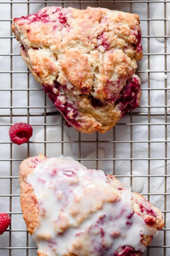 Light, buttery scones bursting with fresh raspberries and topped with a zesty lemon-vanilla icing — perfect for tea time.