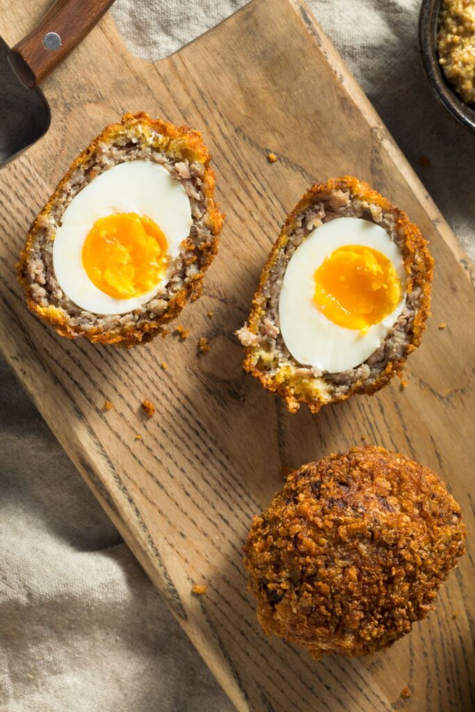 Classic British picnic favourite: eggs wrapped in sausage, coated in breadcrumbs, fried to golden perfection, then baked for extra crisp.