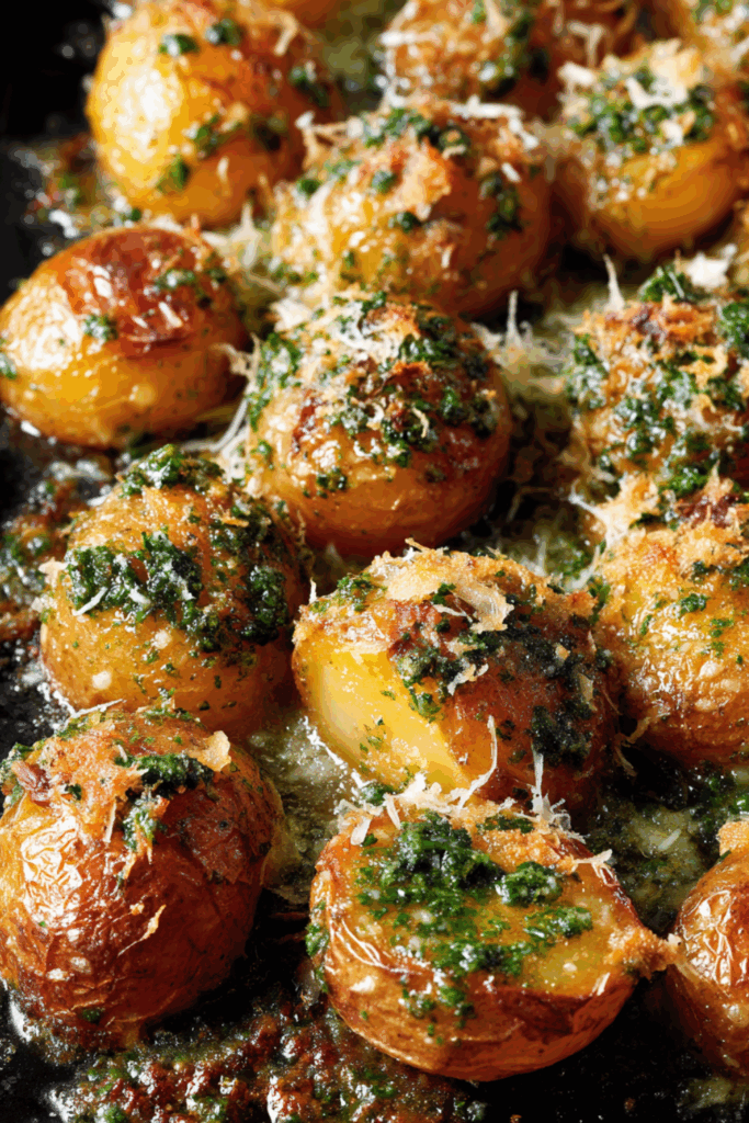 A golden and crispy side of baby new potatoes, smashed and roasted with rich garlic herb butter and Parmesan—simple, rustic, and full of flavor.