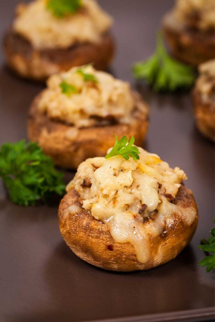 - Fill each mushroom cap generously with the mixture. Top with extra Parmesan.